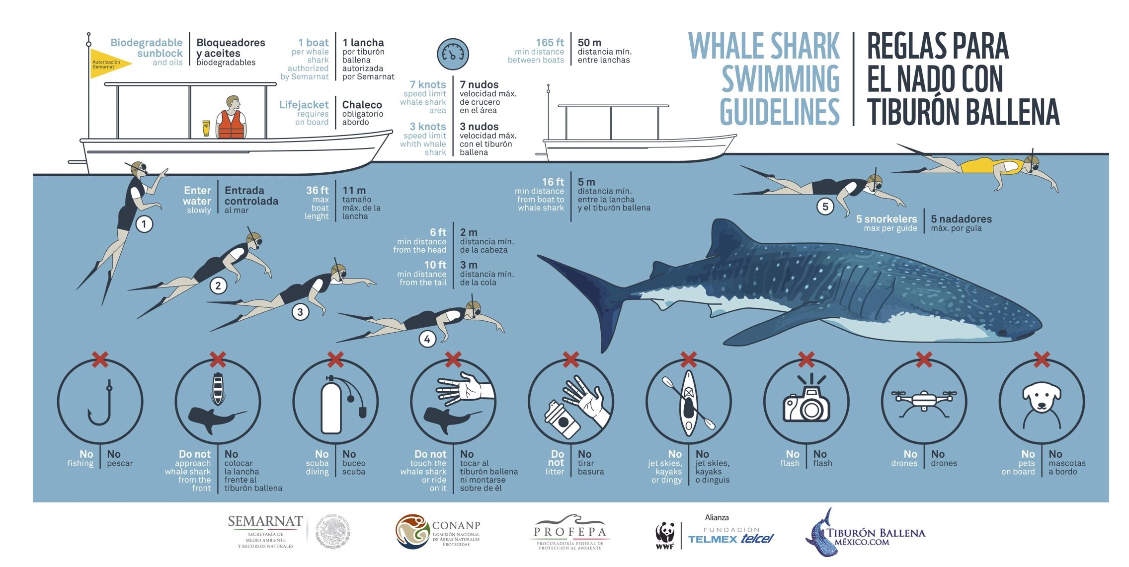 Unlike our other experiences, we can't offer any flexibility with this one because it's strictly regulated, and we are very happy about that! La Paz's whale shark tourism has steadily evolved into a well governed operation that monitors the tour operators, captains, and paying customers. It's a an excellent example of responsible eco-tourim because the welfare of the whale sharks is prioritized. (see graphic below for guidelines)